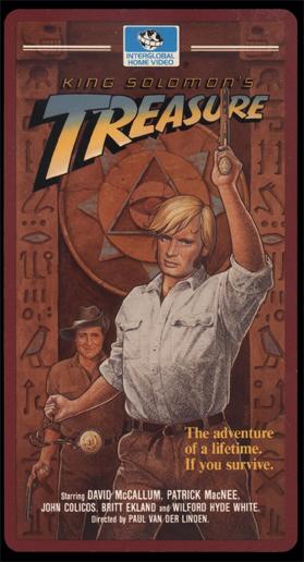 Une jaquette de King Solomon's Treasure, adaptation anglo-canadienne des romans de H. Rider Haggard réalisée par Alvin Rakoff avec David McCallum et Patrick Macnee. Le film a été réalisé en 1979 mais est ressorti en VHS en pleine indianajonesmania, sous ce nouvel habillage assez opportuniste.