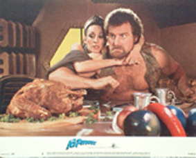 Cette bande de pirates, ô combien hétérogène, se compose d’individus fortement typés : une femme guerrière teigneuse, au look rétro-futuriste furieusement années ’80 (et jouée par Anjelica Huston, si, si), un jeune voleur, meurtrier à l’occasion mais en même temps teeelllement sympathique, un technocrate très terre à terre et aussi quelques robots apathiques, qui ont bizarrement tous l’air très fatigués et qui font preuve d’un sens de l’humour incroyablement déprimant, toute cette petite clique étant dirigée par le courageux et admirable capitaine Jason (interprété avec truculence par Robert Urich, moins connu pour ses rôles au cinéma qu’à la télévision), accompagné de la pimpante princesse Karina (qu’incarne Mary Crosby, une actrice dont le nom n’a qu’un faible pouvoir évocateur mais dont les traits hanteront à jamais la conscience collective américaine pour être ceux de la femme qui tire sur J.R. dans Dallas).