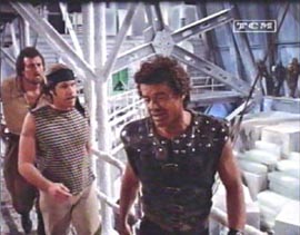 Il serait complètement fastidieux (et surtout beaucoup trop long) de vouloir procéder à une énumération exhaustive de tous les petits délices de ce film, mais en vrac me reviennent : une drogue qui fait planer au sens propre du terme ceux qui en consomment, un enfant robot traumatisé par la mort de ses parents (robots eux aussi, donc), décapités sous ses yeux, et qu’on voit zigzaguer pathétiquement entre leurs carcasses inertes en appelant « Papa ! Maman ! », ainsi qu’une édifiante armée de clones de Lionel Jospin en justaucorps blanc], dont deux des héros pirates rejoignent temporairement les rangs après avoir échappé au supplice d’une insolite machine à émasculer.