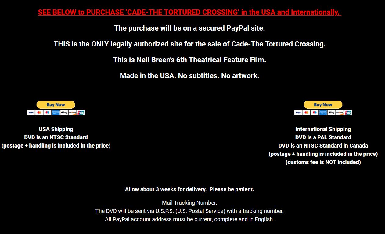 Barème de notationLe film est pour le moment proposé exclusivement sur le site de l'auteur, et celui ouvert spécifiquement pour lui, cade-crossing.com. Attention, on rappelle que l'expérience d'achat chez Breen consiste à mettre 40 balles dans un paypal en priant pour que ca passe, et à recevoir après un temps indéterminé une enveloppe kraft premier prix, un CD dans un boîtier cristal, et un coup de pied au cul.