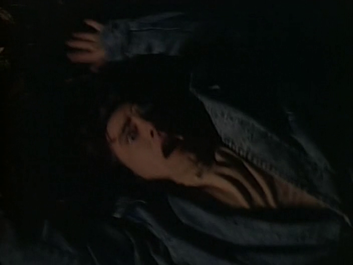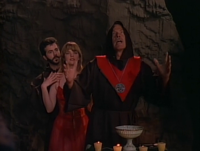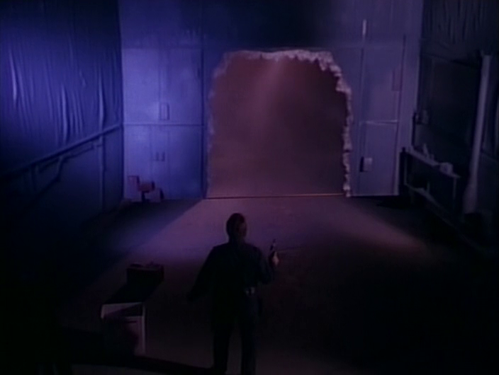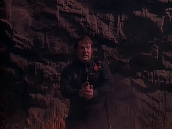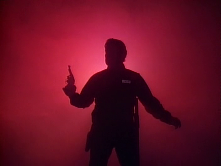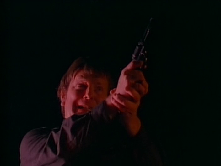 Notre héros accourt au domicile de son ex et y découvre un vortex ouvert sur une autre dimension. Dans cette antichambre de l'Enfer nimbée d'un filtre rougeoyant, le gourou Richard Harrison et un anonyme sataniste barbu s'apprêtent à sacrifier l'ex du héros ainsi que son bébé. La manière dont est filmée la scène est assez risible : pendant cinq minutes, le héros erre dans cet antre infernal, guidé par les cris de terreur de la femme, qui le supplie de sauver son bébé. Et pendant tout ce temps, Richard Harrison abaisse trrrrrèèèèèèèès leeeeeennnnnnnntement son poignard à la vitesse d'un demi-centimètre par minute, en grimaçant et en exorbitant les yeux de la plus comique façon. In extremis, Richard Flynn choisit de sauver le nouveau-né tandis que son ex se fait poignarder par Richard Harrison, avant que ce dernier ne reçoive une balle de la part du héros. Richard Flynn a tout juste le temps de s'échapper avec le mouflet avant que le vortex ne se referme.