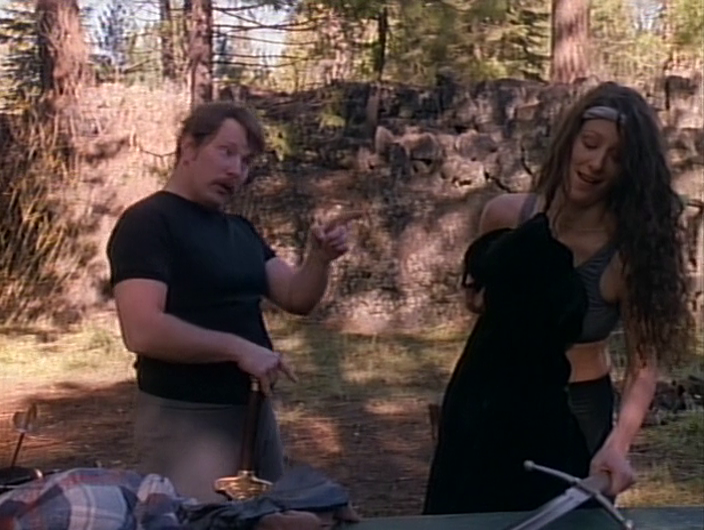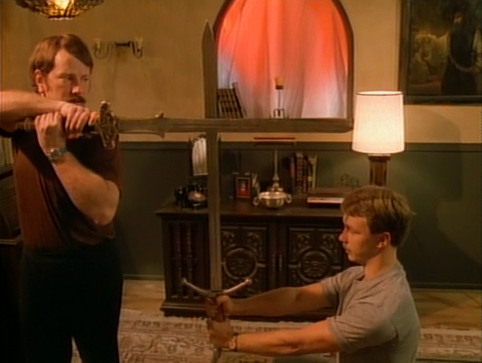 La maître d'arme, c'est Jan Bryant, une escrimeuse professionnelle qu'on a pu croiser en peaux de bêtes dans "Time Barbarians".