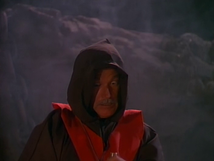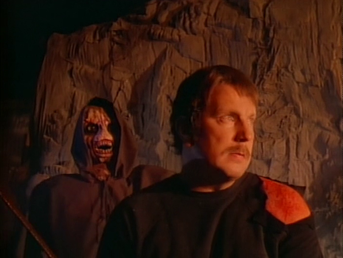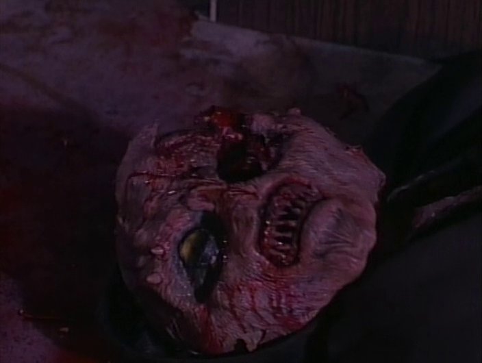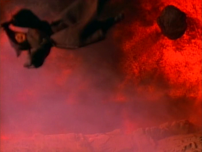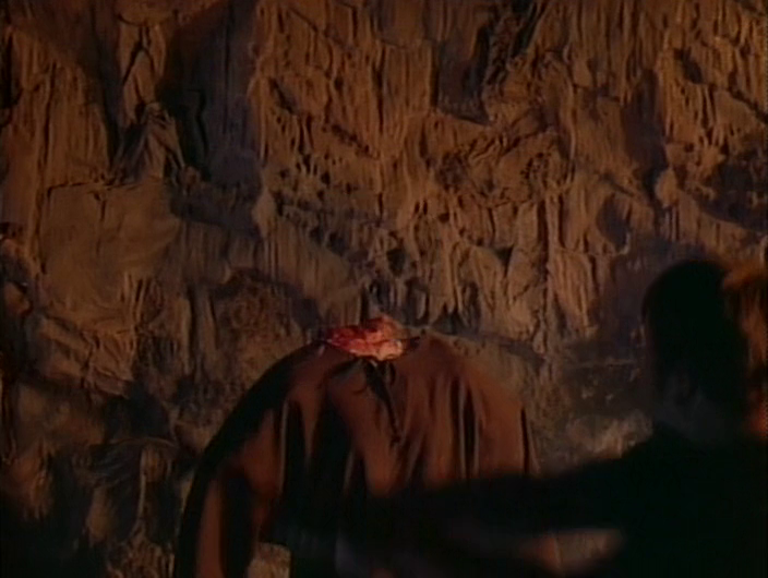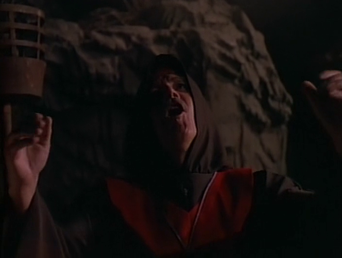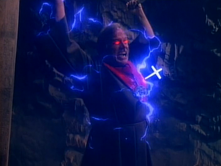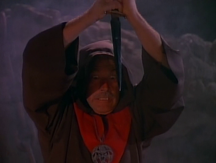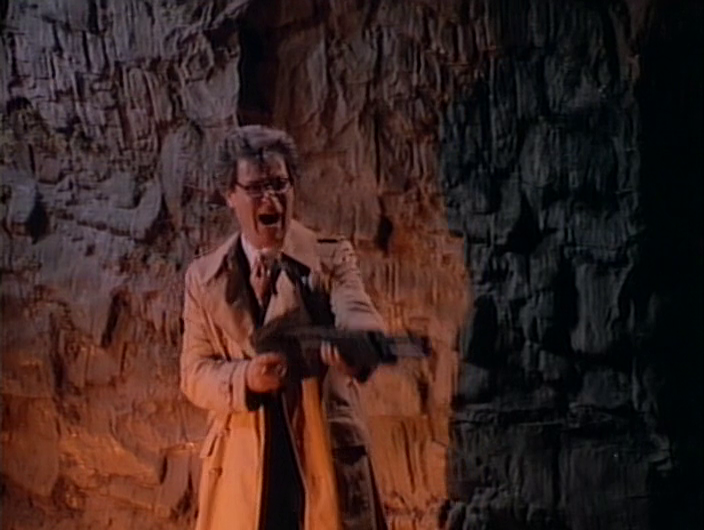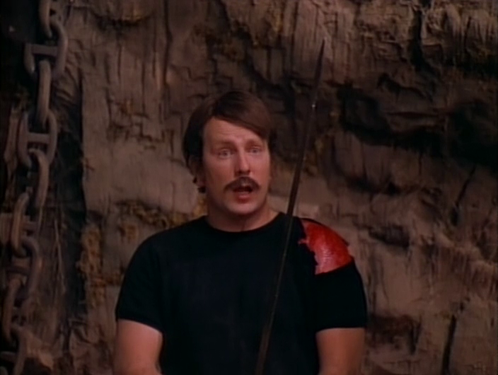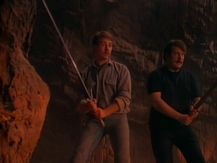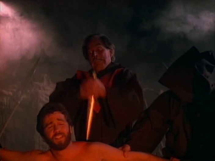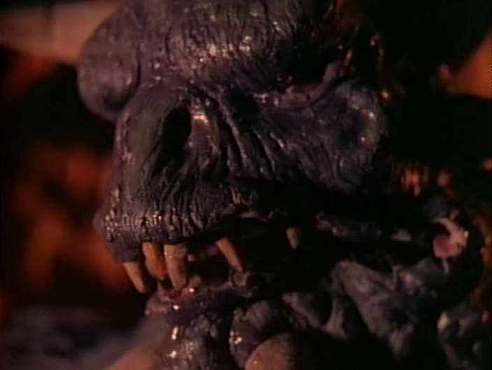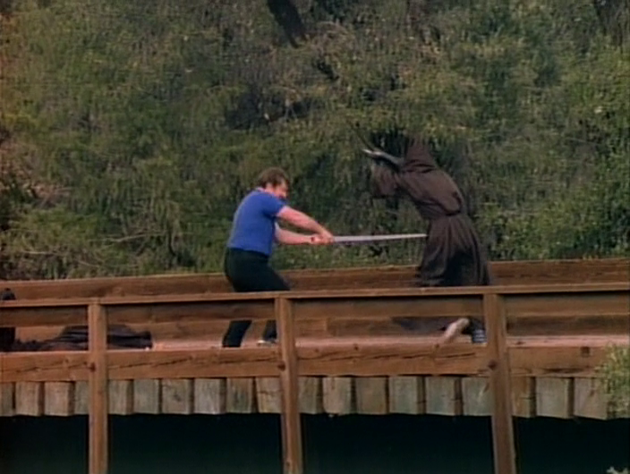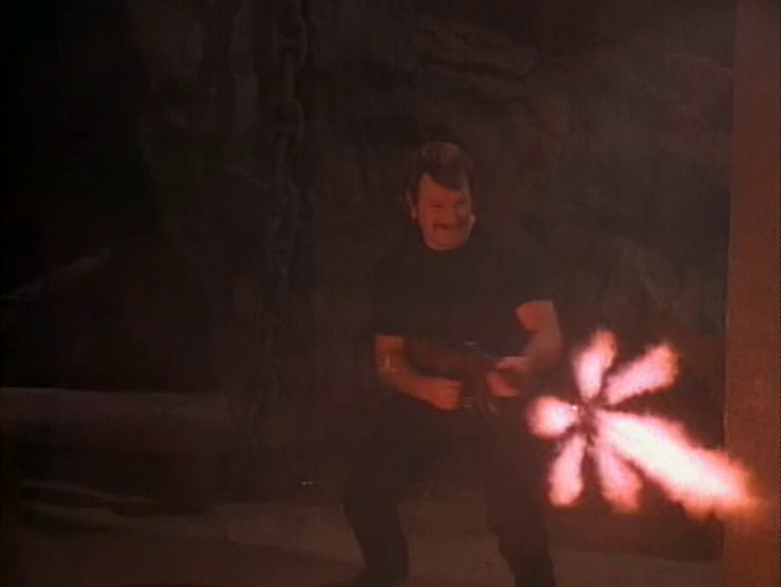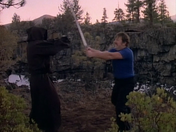 Le meilleur réside dans l'apothéose finale, au cours de laquelle Steve Barkett, après un training montage en règle, débarque à nouveau dans le Purgatoire pour empêcher un nouveau sacrifice rituel. Notre replet sauveur de l'Humanité se met à dégommer à la sulfateuse des démons ringards à soutanes, faisant exploser les têtes factices dans des gerbes de ketchup et de latex. Dans une débauche délirante de pyrotechnie nanarde, notre moustachu provoque des dizaines de chutes de poupées dans une rivière de lave à la sauce bolognaise, puis se prend pour Tarzan et se balance au bout d'une corde au dessus d'un ravin en se faisant doubler par une figurine miniature. Ce grand moment de bourrinage et d'effets spéciaux enfantins se déroule dans la plus grande confusion géographique, le lieu où se situe l'autel du sacrifice ne semblant jamais se trouver au même endroit. Quand il ne nous fait pas "Rambo avec une moustache", Steve nous joue "Highlander avec une moustache", sortant de nulle part son épée sacrée pour décapiter les têtes en mousse des démons, avant de se remettre à canarder avec sa sulfateuse, dont on se demande bien où il l'avait planquée. Puis le revoilà se battant à l'épée... Bref, c'est un réjouissant et hilarant foutoir, entre Richard Harrison qui se met à tirer des éclairs nanars en dessin animé, le démon géant de tout à l'heure qui alterne toujours stop-motion rigolote et marionnette du Muppet Show filmée en gros plan, et la happy end en plans très serrés sur fond vert hyper cheap digne d'une production Cine Excel.