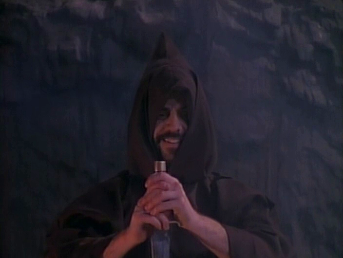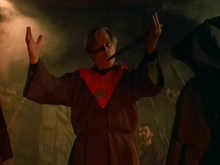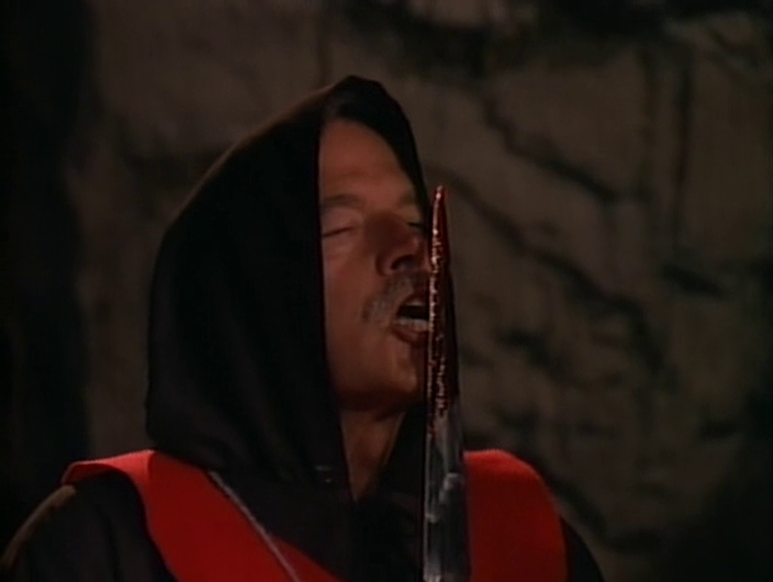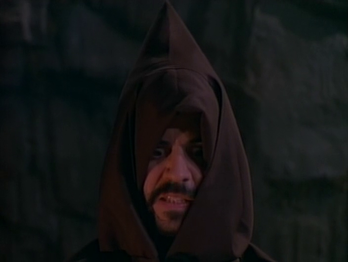 Revenons au film qui nous occupe. Pour faire face à un tel monument de charisme, de virilité et de moustache altière que Steve Barkett, il fallait un antagoniste à la hauteur. Steve l'a trouvé en la personne de Richard Harrison, dieu du bis et idole de Nanarland qu'on ne présente évidemment plus, qui à l'époque était théoriquement à la retraite mais continuait de faire quelques apparitions amicales dans les films de ses potes. Cabotinant juste comme il faut, le grand Richard interprète avec force grimaces le rôle du diabolique Arkham, un gourou de secte sataniste, qui nous est introduit à l'écran au cours d'une messe noire au ridicule achevé. Le héros est appelé au secours par son ancienne fiancée, qui l'a quitté pour le méchant gourou (rassurez-vous, la fille est évidemment envoutée par la magie noire et elle est toujours follement amoureuse de Richard Flynn, car aucune femme normalement constituée ne romprait avec un tel idéal masculin, quand bien même son rival serait Richard Harrison en personne !).