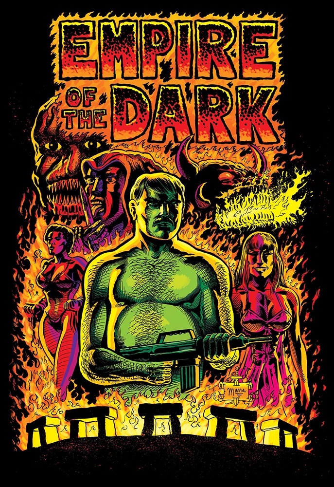 L'inconnu en mal de reconnaissance dont il est question aujourd'hui, c'est Steve Barkett. Acteur principal, producteur, réalisateur, monteur, cascadeur, chorégraphe des combats, scénariste, Steve est l'homme-orchestre de cet écrin à sa gloire qu'est Empire of the Dark. Comme même un homme de son envergure ne pouvait pas faire tout le film à lui tout seul, Steve s'entoure d'une équipe constituée de membres de sa famille (on trouve sur plusieurs postes au générique un Christopher Barkett et une Patricia Barkett) et de fidèles amis, par ailleurs professionnels reconnus du cinéma (Fred Olen Ray, qui produit le film pour 60 000 dollars, mais aussi de grands noms des effets spéciaux comme Jim Danforth, Jim Davidson et Robert Stromberg ; à défaut d'avoir du talent, Steve a des copains talentueux). Tous sont au service d'un beau nanar que l'action hero Steve Barkett illumine de son jeu tout en finesse.