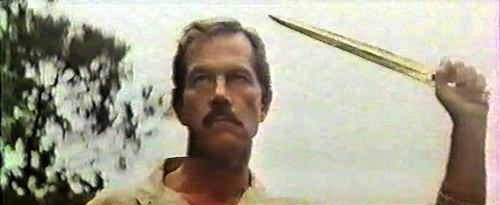 En annonçant du "mythique", la bande-annonce faisait sans doute référence au redoutable monstre reptilien et à l'épais mystère qui l'entoure (à moins qu'il ne se soit agit que de placer un mot qui sonne bien pour survendre le bouzin), mais objectivement, la seule vraie figure mythique de Scorpion Thunderbolt, c'est Richard Harrison, notre moustachu hédoniste préféré, dont on admirera ici la sublime impassibilité. L'acteur, lucide, sait qu'il n'a jamais atteint des sommets : en tournant ce film, il a dû se dire qu'il pourrait difficilement tomber plus bas. A tort bien entendu, puisque son front d'hidalgo allait bientôt être souillé par les bandeaux ninja de l'ultime disgrâce...