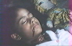Il serait en effet dommage de faire l'impasse sur la niaiserie amusante de notre journaliste, shootant tout ce qui bouge avec son appareil photo et n'hésitant par ailleurs pas à se prostituer pour obtenir une interview de Romero. Elle obtient ainsi une fragile liberté de circulation qu'elle met aussitôt à mal dans un grand moment de n'importe quoi. Rencontrant une fillette et sa poupée dans un bus, elle tombe immédiatement sous son charme enfantin et se laisse aller à lui caresser les cheveux en lui susurrant des petits mots doux. Mais drame, des rebelles détournent le véhicule pour échapper à un contrôle militaire, et rapidement les tirs fusent. La gamine, allongée sous notre héroïne, se prend par un ricochet impossible une balle perdue, et meurt instantanément, un peu de sang séché au coin de la bouche (une mort enfantine nanar, c'est assez rare pour être signalé). Ni une ni deux, Hélène oublie son devoir de non-ingérence et elle laisse la moutarde lui monter au nez avant de se saisir d'un pistolet mitrailleur pour canarder les troupes du général. Ce comportement a bien entendu des conséquences immédiates sur la faisabilité de son reportage.