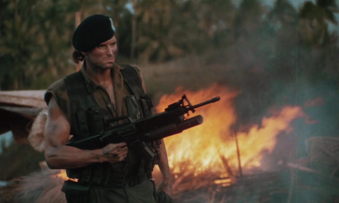 Si l’on a conscience de la parfaite imposture que constitue la présence de Miles O’Keeffe en héros, le décalage finit par envahir la moindre scène du film, décrédibilisant toutes les séquences d’action. Ainsi, dans une scène, une Vietnamienne alliée du héros se sacrifie en affrontant les Communistes les armes à la main pour couvrir sa fuite. C’est du moins ce que Bruno Mattei a voulu nous montrer. Ce que l’on voit à l’écran, c’est plutôt un grand costaud (O’Keeffe) qui met entre les mains de la fille (qui n’a rien d’une combattante) une mitrailleuse trop grande pour elle, avant de se barrer en la laissant affronter les méchants ! Hallucinant de décalage entre les intentions de l’auteur et le résultat final.