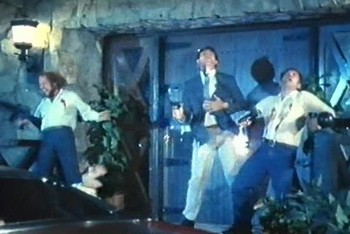 Bref, le gars Morgan l'a un peu mauvaise, ce qui donne l'occasion à Gordon Mitchell de nous gratifier de quelques-unes de ces mimiques impayables dont il a le secret. Linda pourrait se préparer à passer un sale quart d’heure, mais c'était compter sans notre héros des temps nouveaux, j'ai nommé Steve Baker alias Christopher Mitchum ! Chris passait par hasard dans le coin, et il va se retrouver malgré lui embourbé au cœur de l'embrouille. Il commence par sauver la mise de Doris au cours d'une scène absolument mythique. Alors que cette dernière est sur le point de se faire plomber le buffet par les sbires de Morgan, elle arrête la première voiture qui passe, celle de Chris, et le convainc de la prendre à bord. Pendant ce temps, la demi-douzaine de types armés jusqu'aux dents ne semble pas réagir... Ah si, finalement, ils se décident à braquer nos deux amis. Plutôt longs à la détente, ces truands hypra-dangereux.