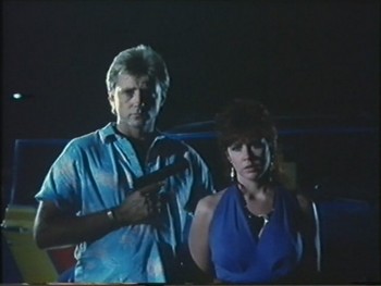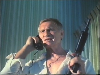 Mais la cerise sur le gâteau, c’est Chris. Un comédien paradoxal, car il se montre si inexistant que lorsqu'il apparaît à l'écran, on ne voit plus que lui. Une sorte de phénomène d’absence irradiante. Un magnifique sommet de nanardise est atteint quand les tourtereaux, enfin réunis, au lieu de chercher un abri, se dépêchent de copuler comme des castors – une scène de lit avec Chris Mitchum, ça frôle la nécrophilie – dans leur maison que les méchants des deux camps ont plusieurs fois visitée. On imagine la suite… A peu près aussi intelligent que le syndrome du « un tueur rôde, séparons-nous » des films d’horreur. Clou de la scène de sexe, Kate, en pleine extase, crie à Chris/Steve « Action ! », ce qui nous donne droit à des scènes d’explosion, les mêmes que celles du film sur lequel bossait notre héros. Le cinéma se regarde beaucoup le nombril et le nanar ne fait pas exception. Chris Mitchum, quant à lui, est si inexpressif que même avec une nana à poil entre les pattes il est pas foutu d'exprimer autre chose que l'interrogation d'un teckel sur l'horaire de sa pâtée. Mitchum Junior, le premier héros en état de mort cérébrale.