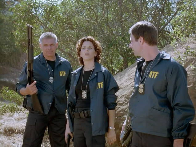 L'autre héros du film, c'est ce bon vieux Brent Huff qui, après avoir cassé du Viêt chez Bruno Mattei et défoncé de l'Amazone chez Just Jaeckin, va cette fois dessouder du terroriste pour ce qui constitue la partie "action bourrine" du film, Fred Olen Ray nous ayant pondu une oeuvre aux allures de deux en un involontaire. Et lorsqu'il s'agit de défourailler du terroriste, le beau Brent est un champion puisqu'il abat les sbires tantôt sans même les avoir regardé, tantôt en visant trois mètres à côté, alors qu'il leur tire dessus à bout portant. Trop fort le mec ! Les gunfights sont d'ailleurs un des points forts en nanardise du film, avec leur figurants qui en font des caisses dans les convulsions avec un décalage d'une seconde par rapport aux coups de feu et sans que leur corps présente le moindre impact de balle. Et pour apporter une touche d'humour vaudevillesque, histoire de se détendre entre deux déchaînements de violence clownesques, notre super-agent de la CIA macho entre en rivalité avec l'agente de l'ATF Yvette Nipar. Tous deux nous rejouent la pièce éculée du futur couple qui se drague tout en se taquinant gentiment pour savoir qui est le meilleur et lequel des deux mettra la main sur le méchant et le Thunder Strike en premier. La conviction imperturbable des acteurs apporte un coefficient sympathie élevé à leurs personnages, lesquels sont d'ailleurs tellement stéréotypés qu'ils en deviennent paradoxalement attachants.
