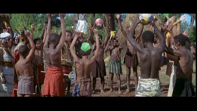 Si les personnages sont d’une débilité profonde, ils ont au moins l’excuse d’évoluer dans un univers très largement à leur mesure. Sans vouloir nous attarder sur les amazones blanches « vierges » mais toujours prêtes à se faire culbuter par nos héros, ni sur les Soviétiques qui gardent leurs chapkas au cœur de la jungle et se mettent à danser le kasatchok dès qu’ils sont contents, il faut tout de même citer les indigènes africains, que l’on n’oserait pas mettre en scène de nos jours sous peine de se voir infliger un procès carabiné. En effet, les Noirs présents dans ce film, amadoués par les Soviets à l’aide de jouets en plastique, complètement arriérés, sont d’une bêtise si crasse que je ne peux, malgré mon habituelle antipathie pour le politiquement correct, que constater le racisme assez délirant de leur représentation.
