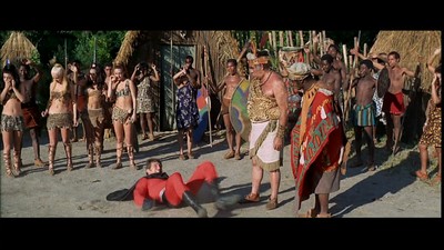 Un autre atout du film est son amoralité parfaite : les personnages – y compris les gentils – passent leur temps à se trahir sans aucune vergogne, comme dans un dessin animé particulièrement vicieux. Notons par ailleurs que les héros sont des individus particulièrement peu recommandables, puisque Scott trouve désopilant au début du film d’apprendre que Dick et Martin vont se faire empaler – il est envoyé à leur rescousse quasiment de force – et que la mort de leur guide, pourtant le personnage comique le plus sympathique du film, ne semble absolument pas toucher les trois Supermen. Une construction un tant soit peu cohérente des personnages n’est cependant pas ce que l’on demande à un film écrit à l’arrache, réalisé à la diable et joué n’importe comment. « Les 3 Supermen dans la jungle » est au contraire à l’image de son titre : débile, réjouissant et d’une énergie à perdre haleine.