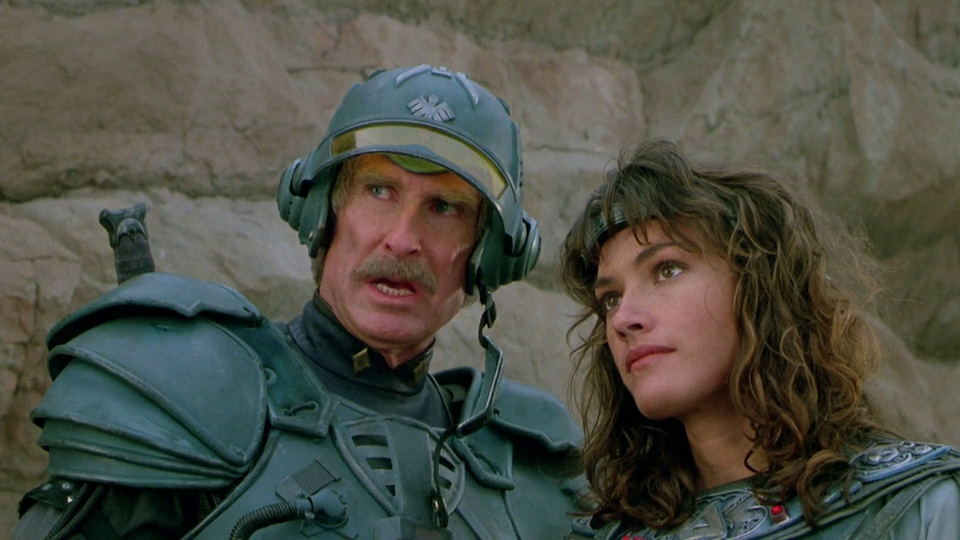 On notera également la présence la toujours intrigante Meg Foster (« Invasion Los Angeles »), qui joue le rôle d’Evil-Lyn (en VF, Malicia) la compagne de Skeletor, ses superbes yeux bleus étant ici recouverts de lentilles de contact bleu électrique lui donnant l’allure d’une extraterrestre shootée. Pas grand-chose de convaincant à se mettre sous la dent questions méchants, le reste des personnages étant réduits à leur statut de sbires grand-guignolesques.