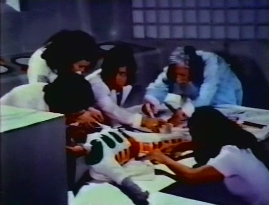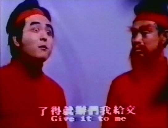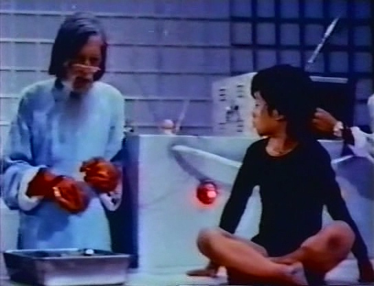 Alors que le jeune Hsiao Po est en plein processus de « sbirisation », avec des rangées de loupiottes multicolores qui clignotent avec conviction, son petit frère Hsiao Wen le sauve en urinant sur le Dr. Wu et son panneau de commandes. Zblam ! Krrr ! Pfzzzt ! Le labo se transforme en discothèque, les sbires entrent en transe, c’est la méga teuf grosse catastrophe. Profitant des étincelles, fumigènes, et d’un montage confus au possible, les marmots s’enfuient.