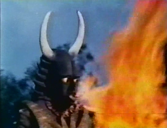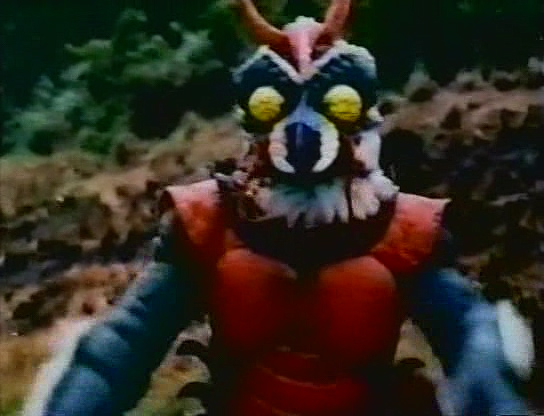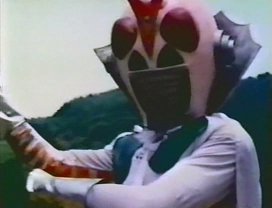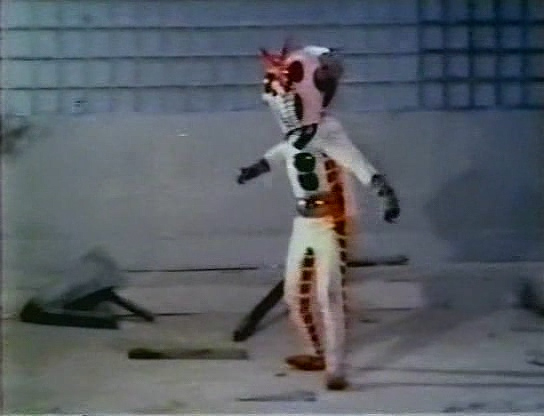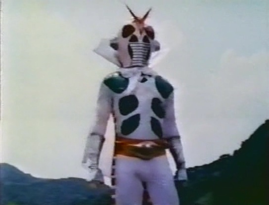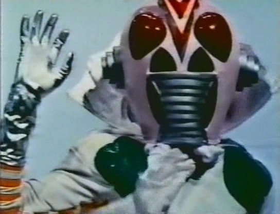 Nous voici donc devant une énième et tardive copie des Kamen Riders, bricolée avec des moyens dérisoires pour profiter de l’engouement des bambins pour les superhéros nippons à tête de mouche. Le costume du héros est d’ailleurs une repompe flagrante de celui de Kamen Rider X, avec l’ajout d’oreilles à la Ultraman, d’une mini cape, et surtout d’une grosse collerette parfaitement ridicule. Le look des sbires est également un décalque évident de ceux de Kamen Rider X, avec leur combinaison noire et leur masque blanc. Preuve que le film mange vraiment à tous les râteliers, ils ont même ajouté un perso au look de Mazinger bien mis en avant sur l’affiche.