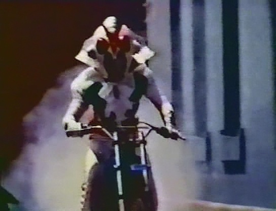 The Invincible Space Streaker est donc un ersatz de tokusatsu japonais, comme Super Inframan. Sauf qu’en comparaison, Super Inframan est un nanar de luxe, une véritable super production. À côté, The Invincible Space Streaker c’est du tokusatsu de clochard, branque et fauché, à la limite de l’amateurisme. Même avec l’image floue et cradingue d’un rip-VHS, la misère des costumes et des décors saute aux yeux, et on devine qu’en HD on aurait pu voir les agrafes et les bouts de Scotch. Les chorégraphies de combats sont inexistantes, avec des protagonistes qui se contentent d’agiter les pieds et les mains n’importe comment en sautillant partout. Pour faire comme les Kamen Riders, ça roule et ça se bagarre en motocyclettes 125 cm³ sur des terrains vagues, avec les sbires du Dr. Wu d’un côté, des policiers taïwanais de l’autre, et l’anarchie qui tient les rênes. Les explosions et la fureur du zoom font des ravages. C’est le chaos érigé en principe de mise en scène.