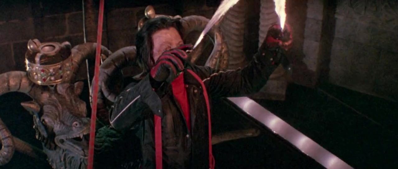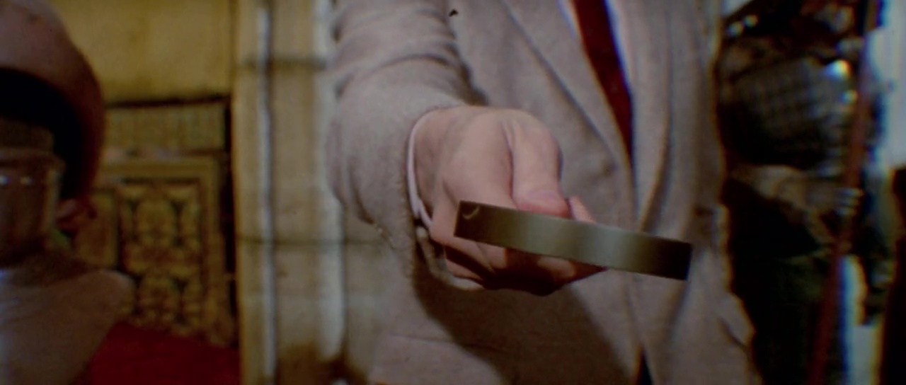 Et des objets face caméra, vous allez en manger. Ainsi, si vous aviez vu le film au cinéma en 1983, vous auriez eu le privilège de voir en gros plan (ou en contre-plongée) diverses choses de la vie courante telles que (liste quasi exhaustive) : un aigle, une liane, une corde, un serpent, un oiseau en plastique, un chien qui saute, un chien qui aboie, un type qui se jette à travers la fenêtre, des lambeaux de tissu, une main de squelette, une épée, un sceptre, une arbalète qui lévite, un carreau d’arbalète qui lévite, un javelot, une masse cloutée, une épée qui tombe d’un plafond, un mousquet, un rouleau à pointes (?), une flèche enflammée, une couronne, une clef qui va dans la couronne, une loupe, la même clef que tout à l’heure mais sous un autre angle, des ustensiles de cuisine (une marmite je crois), un jet d’eau, une porte de frigo, toujours la même clef que tout à l’heure mais qui lévite, des casseroles qui explosent, des pots qui éclatent, des étagères qui tombent, des draps qui volent, des trapézistes, une plume, une main, une main qui tient une plume, un transpondeur, des sangles, un pied, un mousqueton, une paire de ciseaux, un cierge, un brasero, un couteau, des tambourins, un serpent en plastique, un chalumeau, des jets de flammes, des boules de feu (tirées par des ficelles) et des trucs qui crépitent dans différentes gerbes de couleurs.