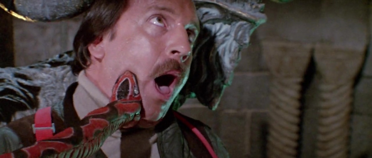 Mais voilà : si Harrison Ford possède une allure virile, un visage de baroudeur aux yeux perçants et arbore la chemise déchirée comme une pin-up les porte-jarretelles, ce n’est pas le cas de notre acteur italien. Non, Tony Anthony c’est plutôt Droopy avec une parka rouge qui le fait ressembler au bonhomme Michelin roulé dans de la terre battue, décidant avec l’agilité d’une brouette rouillée de se prendre pour Philippe de Dieuleveult. Notre aventurier va nous prouver tout son talent dans une longue (20 minutes !) scène d’introduction où il prend tous les risques pour aller chercher un artefact planqué dans le donjon d’un château, ceci en se vautrant toutes les trente secondes, en se faisant courser par divers animaux et en déclenchant tous les pièges possibles comme un aveugle le ferait dans un champ de mines antipersonnel.