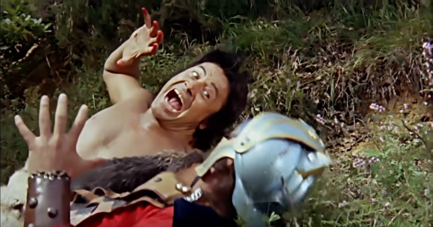 Cüneyt a donc vécu dans la forêt, élevé par les lions, sans jamais savoir qu’un fourbe lui avait volé son trône et tué son père. D’autant que le méchant a récidivé : il est à la tête d’une bande de chevaliers cruels (en fait quelques figurants encapuchonnés sous-payés qui se sentent obliger de surjouer comme des malades à chaque fois qu’ils meurent) qui volent, violent et tuent. A vrai dire, ils commettent tellement d’atrocités que les énumérer toutes relèverait du travail d’un surhomme. Justement, en parlant de surhomme, Cüneyt n’apprécie pas trop qu’on torture des gens à côté de chez lui. Il va donc massacrer quelques soldats afin de leur apprendre les bonnes manières.