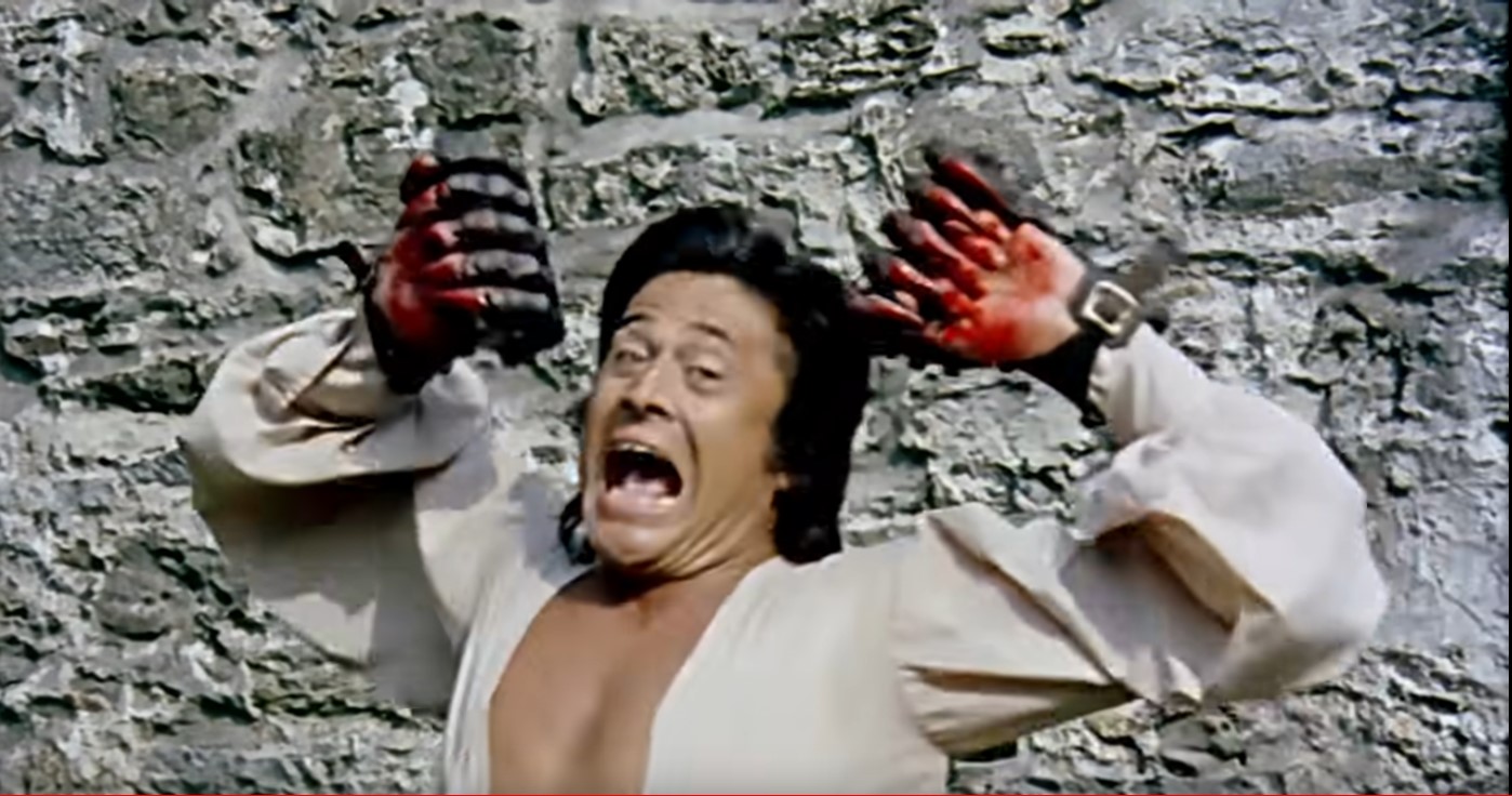 Et évidement notre brave Cüneyt tombe dans le piège tendu par le félon et ses sbires. Il a tout de même le temps de sauver sa femme enceinte en retenant la porte pendant que les soldats le charcutent de toutes parts. Le grand méchant moustachu l’achève en lui coupant les deux mains (quelle méchanceté il a ce méchant !). Sa femme décède des suites de l’accouchement, après avoir abandonné son bébé aux lions.