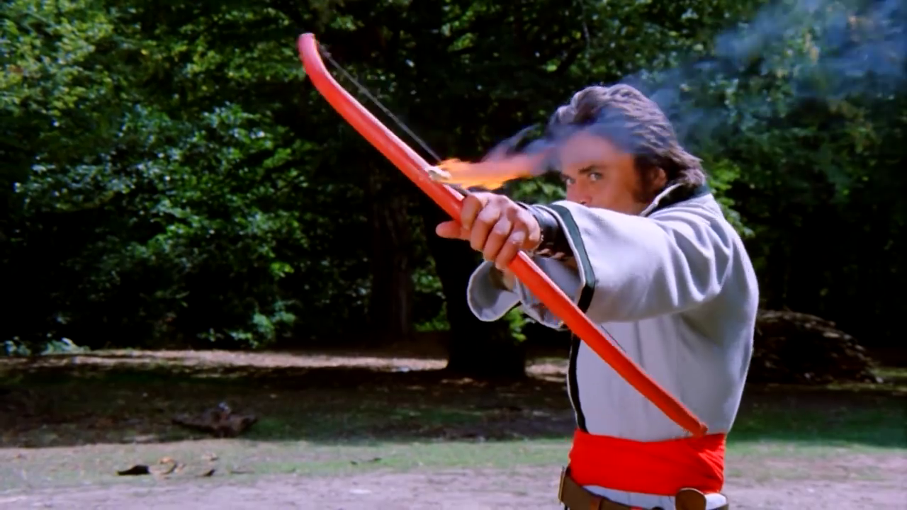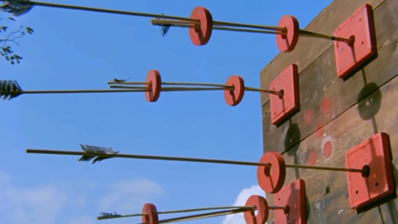 Sur ces entrefaites arrive un Cüneyt tout en décontraction. Alors que les trois premiers participants ont tous tapé dans le mille et en chopant le beignet en plus, on se dit "mais comment peut-il faire mieux ?". On assiste alors à ce dont tout le monde se doutait mais que personne n’osait réaliser à part Natuk Baitan (réalisateur de chefs-d’œuvre comme la saga Battal Gazi mais aussi la saga Kara Murat et Lion Man) : Cüneyt qui prend quatre flèches dans son fourreau, demande au lanceur de beignets d’en lancer quatre à la fois et pfuiiiiiii (c’est le bruit des flèches), il transperce les trois flèches déjà tirées et chope tous les beignets en plus.