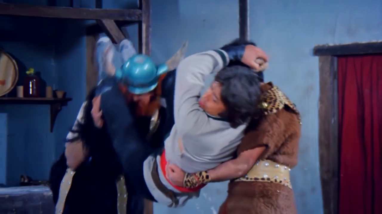 La scène suivante est phénoménale, tellement nanarde que je ne sais pas comment vous la conter. Baba est fait prisonnier et emmené dans une prison située dans une carrière (en réalité une citerne de l'époque).