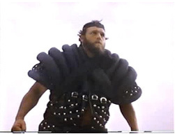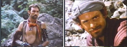 En fin de colonne, nous retrouvons des seconds couteaux récurrents du bis made in Manille comme David Brass (l'otage de Jakoda qui demande "Bousille-leur la gueule à tous ces salauds !" à Mike Ransom dans "Strike Commando"), l'inévitable David Light et sa belle trogne de vicelard, ici fringué en drag-queen et pour une fois pas dans un rôle de méchant, et Steve Rogers, affublé d'un bonnet de Schtroumf du futur. Enfin, histoire de me la péter "physionomiste du bis" jusqu'au bout et de faire passer à la postérité un honnête figurant dont le bon goût vestimentaire n'avait pas encore été célébré, signalons la brève présence d'un septième baroudeur joué par Arturo Estrada, qui jouait le sergent instructeur sévère-mais-juste de Bruce Baron et son commando dans "Les Massacreurs" (ça vous épate que je sache tout ça, hein ? Hein ?... Comment ça, non ?). Ce personnage se fait occire à la première escarmouche contre un gros barbu, qui promenait tranquillement son domestique porte-parasol à travers le désert tout en maltraitant ses deux esclaves pour tuer le temps - et oui, que voulez-vous, les occupations sont rares dans une carrière de sable ne comptant qu'un pneu et une vieille toile de tente pour tout mobilier.