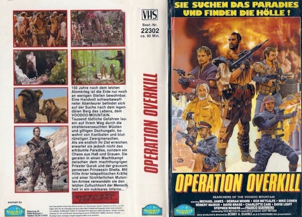 Barème de notationCe film est sorti un peu partout en VHS (Etats-Unis, Royaume-Uni, Allemagne, Pays-Bas, Espagne, Grèce, Danemark, Suède, Finlande…), sous les titres "Searchers of the Voodoo Mountain", "Warriors of the Apocalypse" ou encore "Operation Overkill". Mais il n’est semble t-il jamais sorti en France (donc pas de VF), et n’a à ce jour pas été ré-édité en DVD.