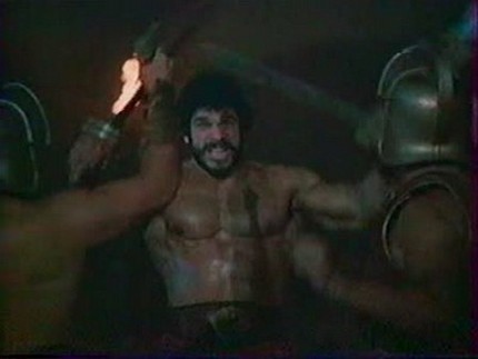 20 ans plus tard, Hercule c’est Lou Ferrigno, et il montre ses gros biscotos en tirant une charrue faite de mini menhirs. Foutrebouc ! Son père adoptif est attaqué. Ni une ni deux, Lou Ferrigno nous montre qu’un gros balèze ça peut aussi courir hyper vite. Mais l’ours a déjà tué son père, et alors qu’il se trouvait devant lui le plan d’avant, Hercule le prend par derrière. Bien belle image que celle de ce figurant pauvrement grimé avec un déguisement de nounours pelucheux contre Hercule qui fait consciencieusement saillir tous ses biscotos, alors que l’autre ne serre même pas fort.