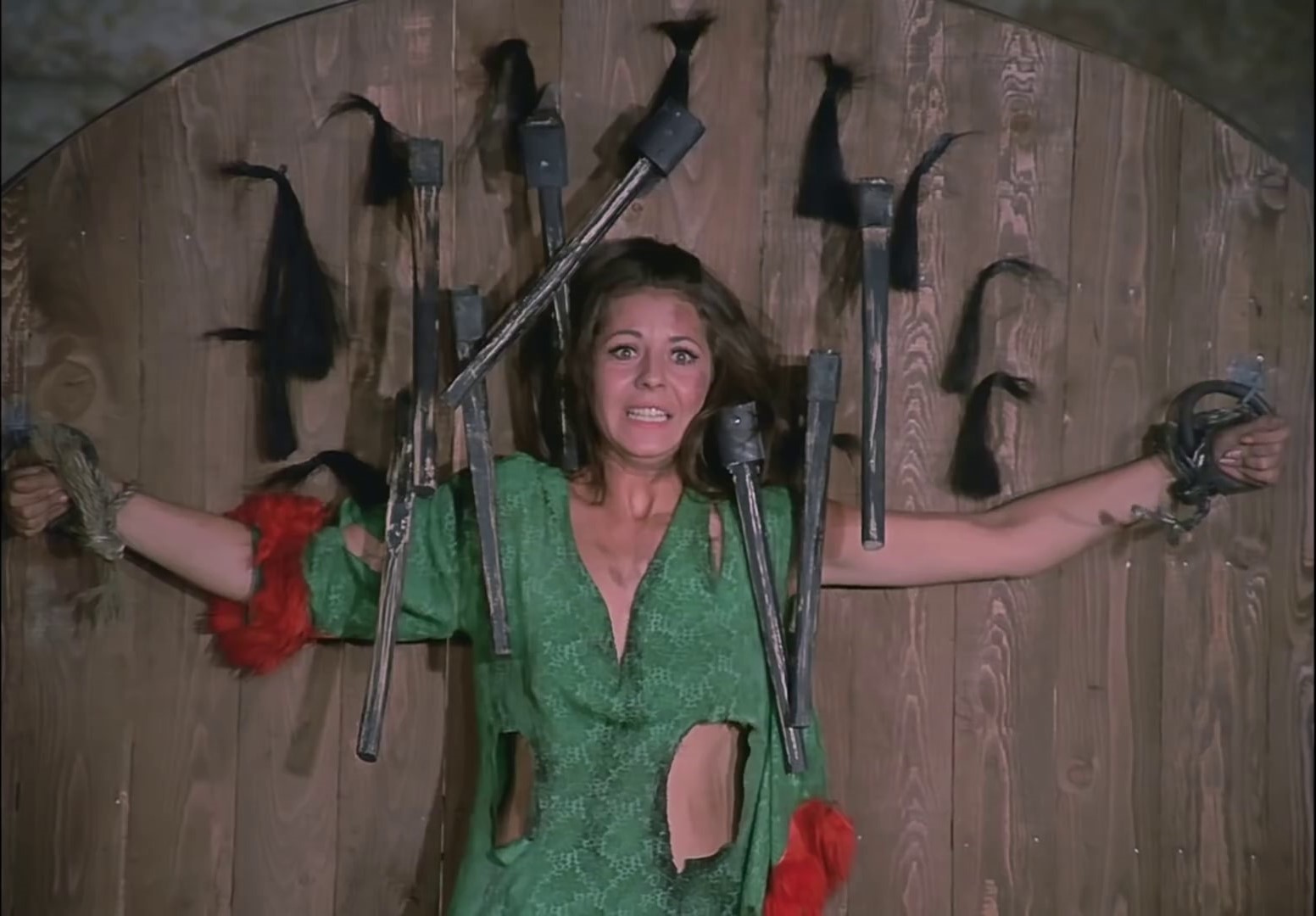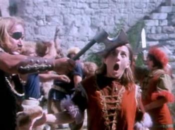 Le support DVD, qui magnifierait n’importe quel film turc, prend une importance toute particulière avec Tarkan tant ce film aime les couleurs qui pètent et le fait savoir. Il suffit d’observer le drakkar des Vikings : il aurait bien plus sa place à Disneyland que dans les rudes mers du Nord. Les bastons sont un parfait régal. Les combattants portent en effet tous des fourrures aux couleurs pastels des plus improbables : bleue, rose ou violette, la fourrure va se nicher partout, y compris sur les accessoires les plus inattendus. Costumes saugrenus et figurants goguenards forment un cocktail explosif. Difficile en effet de confondre le figurant turc de base avec un Viking. Perruques et accessoires semblent avoir été bricolés à partir de panoplies de Ragnar le joyeux Viking achetées au magasin de jouets du coin. Au lieu de camoufler la différence, cet attirail a une furieuse tendance à produire l’effet inverse, surtout quand un figurant à la flamboyante perruque rousse arbore dans le même temps une très brune barbe de trois jours, ou quand un autre perd ses cheveux longs en même temps que son casque !