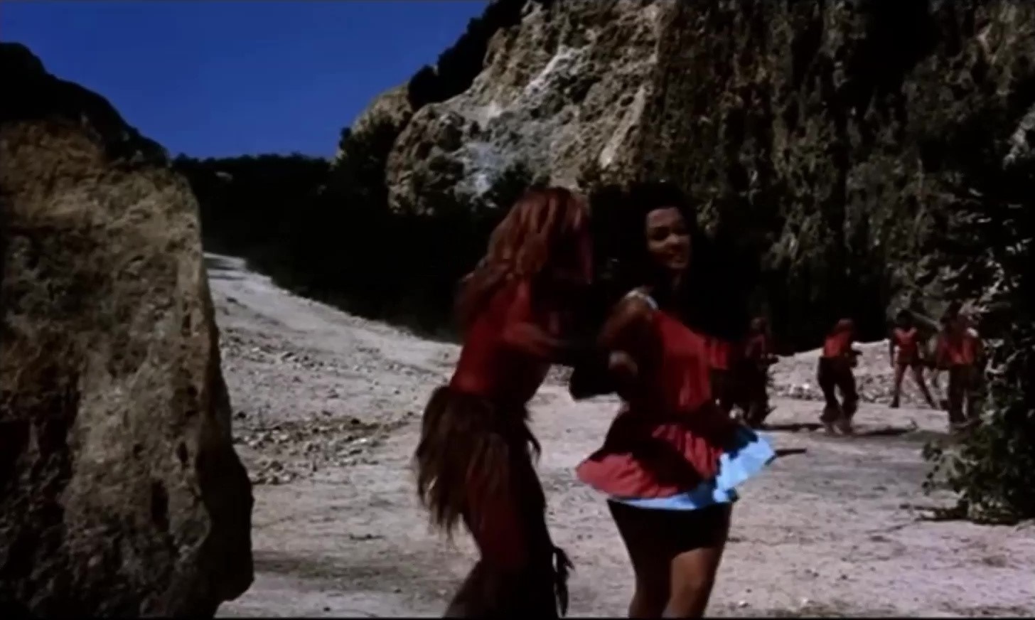 Hélas, sur le chemin du camp des Thraces vivent des hommes préhistoriques blonds (si, si !). Les rustres tentent de violenter la belle Etna qui, heureusement pour nous, vicelards que nous sommes, se débat comme elle peut en se tortillant de la micro-jupe. Vulcain et son désormais indéfectible ami le Nain arrivent à sa rescousse et mettent les primates décolorés hors d'état de nuire en les assassinant à coups de beigne. Ouf ! Bon, allez, assez tardé, go ahead to the Thraces !