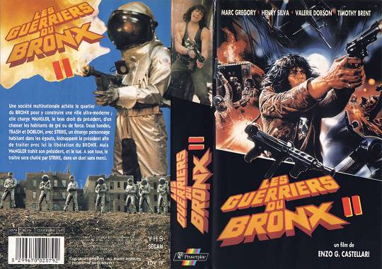 En 1983, Castellari remet le couvert pour un second opus, logiquement titré Les Guerriers du Bronx 2 chez nous (Fuga dal Bronx en VO, plagiat intégral du titre italien de New York 1997, qui traduit fidèlement Escape from New York par Fuga da New York). Prétexte fallacieux à une débauche d’action dans le plus pur style « bisserie ritale », le scénario demeure grosso modo le même : dans un futur proche où la société est plus que jamais sous le joug de multinationales sans scrupules, l’une d’elles souhaite faire table rase du vaste dépotoir qu’est devenu le Bronx pour y reconstruire du tout nouveau tout beau. Pour ce faire, elle charge l’impitoyable Wangler (Henry Silva dans un énième rôle de salaud) et ses exterminateurs d’éradiquer la vermine qui hante encore les lieux, à savoir des miséreux qui n’ont d’autre endroit où aller et quelques loubards punkoïdes. C’est la curée : la faune bigarrée du Bronx se fait lâchement massacrer par le Grand Capital et un nazillon sadique. Révolté, le spectateur ne peut que serrer ses petits poings rageurs dans l’attente d’un héros authentique. Celui-ci surgit alors à moto, incarné par un Mark Gregory moins expressif que jamais, crinière d’étalon au vent et buste ceint dans un débardeur à tête de mort du plus bel effet. Trash est de retour. Le public de nanardeurs applaudit à tout rompre.