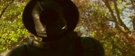 Comme s’y attendait quiconque ayant lu le titre et vu l’affiche, l’autre météorite révèle également un extraterrestre hostile, sorte de chasseur intergalactique, capable de se rendre invisible, désireux d’accrocher la précédente créature à son tableau de chasse et ne rechignant pas à découvrir les mérites du gibier humain. Notons tout de suite l’absence de ressemblance entre le simili-Predator dessiné sur l’affiche et la créature effectivement présente dans le film : foin de cyborg insectoïde à la pointe de la science futuriste, le chasseur venu de l’espace est une sorte d’épouvantail coiffé d’un chapeau à mi-chemin entre le couvre-chef chinois et le plateau à fromage, le visage couvert d’une sorte de masque à gaz avec à la hauteur du nez une espèce de lampe rouge qui lui donne très nettement l’air d’un clown.