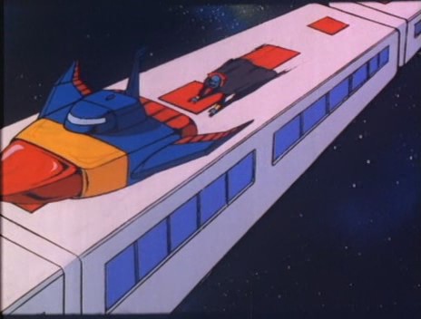 Ajoutons enfin que les enfants n’ont pas la moindre personnalité et ne servent strictement à rien dans le récit sinon à garantir le quota « enfance innocente à protéger ». La présence du train - nommé « Super express » - sillonnant l’espace a pourtant une utilité bien précise : celle de recaser un plagiat de « Galaxy express 999 ».Après Go Nagai, c’est Leiji Matsumoto qui se voit pillé sans vergogne : les idées des autres, ça coûte pas cher et ça peut rapporter gros ! Quant à l’adversaire de Mazinger 7 lors d’un combat spatial, ce n’est ni plus que moins que Raydeen, autre robot géant japonais, dont on a néanmoins pris soin de changer la couleur. Mais bon Dieu, c’est si dur que ça d’imaginer un design de robot soi-même ????