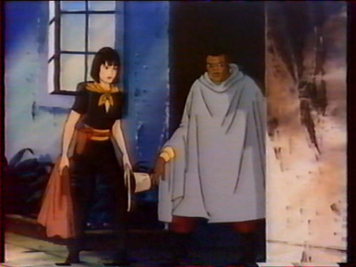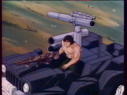 Je pourrais causer des heures des scènes les plus marquantes : les 3 punks madmaxiens qui prennent d'assaut le siège des Nation-Unies, le croiseur Yamamoto qui détruit une île en une salve de tirs mais qui se fait ruiner par Rambo en pédalo, Rambo qui fait des sauts périlleux sur sa moto lancée à fond sur le toit d'un train, Rambo entouré par des tanks esquivant des obus tirés à 2 mètres de lui, Rambo qui détruit des missiles à la sulfateuse à bout portant, Rambo qui fait des paquets de mines flottantes avec son propulseur sous-marin, Rambo qui fait la morale à tout le monde sur l'importance de la liberté, Rambo, Rambo, raaaaaah, j'en peux plus, c'est trop trop trop !! Non, ça ne sert à rien de tenter de décrire l'indescriptible. C'est de la folie furieuse, et pis c'est tout. Et le pire, c'est que c'est tout à fait le genre de DA où il faut faire des arrêts sur image régulièrement pour remarquer des détails complètement loufoques, des positions de personnages étranges, où il faut se repasser un extrait pour bien apprécier les dialogues ou les déformations soudaines des visages, bref, du macro-nanar associé à du micro-nanar permanent. Pas le choix, faut que je me le rematte.
