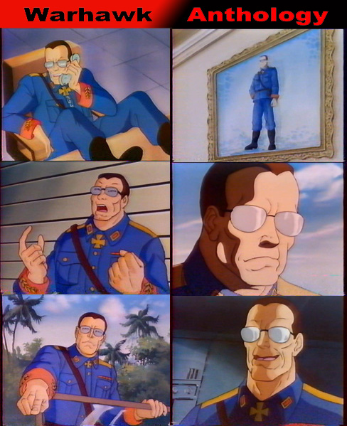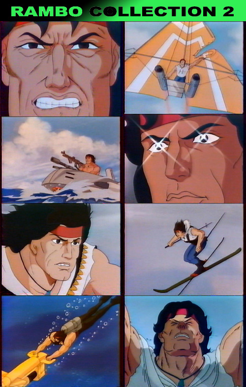 Mais voyez-vous, cette première K7 a un avantage énorme sur les autres. Les 5 épisodes annoncés sont en fait un métrage complet de 100 minutes, sans pause ni temps mort. En effet, elle contient la mini-série pilote réalisée pour tester la tolérance du public avant d'en produire davantage. C'est réussi, car ce sont là 100 minutes de destruction ininterrompue de véhicules de toutes sortes (centaines de tanks, nouveau prototype de bombardier, croiseurs de plusieurs kilomètres de long, etc.), d'explosions gigantesques, de raccords foireux, de combats acharnés dans tous les paysages possibles, de bases ravagées, de guerre sans fin pour prendre le contrôle de Tierra Libre, un pauvre petit pays insignifiant et pacifiste qui ne méritait vraiment pas un tel acharnement. Et surtout, c'est Rambo pire que jamais, qui court pendant 100 minutes en démolissant des armées de militaires à lui tout seul, matériel compris, Rambo qui détruit des bases entières tout en skiant peinard, qui fait de la chute libre pour attaquer l'aviation ennemie, Rambo qui lance des pieux explosifs avec son arc de chasse, Rambo qui explose tout avec une sarbacane lance-roquettes, Rambo qui enrôle des gamins dans l'armée, Rambo qui fait des planchettes japonaises à des colonnes de pierre de plusieurs tonnes, Rambo l'invincible, l'infatigable, l'indestructible, l'omnipotent, le surprenant, le stratège, le vanneur, l'Agénésie aréolo-mamelonnaire, le Héros de la Liberté. Malheureusement, ce n'est pas Sylvester Stallone qui fait la voix en VO, la version originale serait encore plus collector ! Rajoutez à tout ça des méchants tous plus hallucinants les uns que les autres, menés de main de fer par un boss ultra persévérant à l'accent allemand digne des meilleures comédies françaises (et je ne parle pas des Portugo-mexicains qui traînent) : Warhawk, le seul et unique méchant intergalactique qui ose faire tanguer des barques remplies de bananes pour faire régner la Terreur.