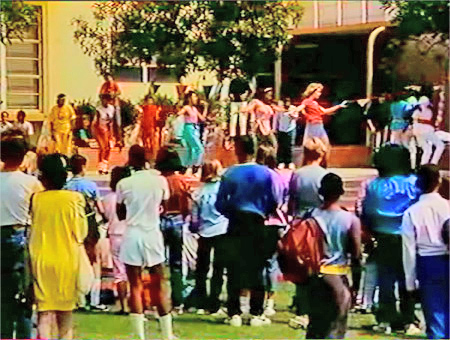 Par ailleurs, il est intéressant de souligner la contestation du modèle "Melrose Place" jusque dans les ethnies représentées à l'écran. Le p'tit blanc est ici minoritaire, la majorité du casting offrant un teint basané quasi-indonésien qui a de quoi interroger le spectateur. Oui, ça peut paraître con dit comme ça, mais j'ai vraiment été persuadé pendant tout le film que j'avais affaire à une tentative d'imitation philippine d'un campus movie. Je ne sais pas dans quel quartier le métrage a été tourné, probablement que la population locale devait y être marquée par l'immigration hispanique (les noms des acteurs vont dans ce sens), mais le résultat à l'écran est très intriguant, et ma foi agréablement dépaysant. Je suspecte toutefois la qualité de ma VHS d'être partiellement responsable de ce métissage de l'autre bout du monde.
