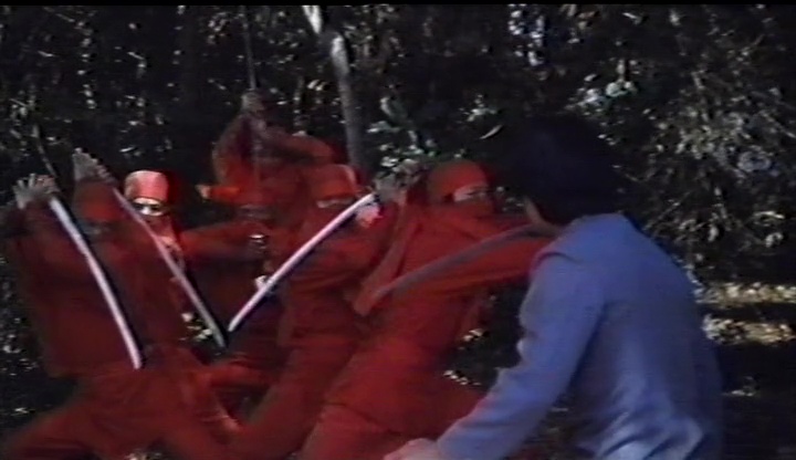 Dirigée par un barbu obèse, la bande des affreux est en tout cas, pour notre plus grand plaisir, une annexe de l’empire ninja, puisqu’elle fait exécuter l’ensemble de ses basses œuvres par des guerriers des ténèbres aux tenues d’un rouge pimpant (un indice supplémentaire sur la couleur politique naturelle des méchants !). Une grande partie du film va donc consister en une succession hystérique de combats de ninjas, sautant comme des zébulons dans tous les sens. « Dragon Force » appartient en effet à la catégorie des nanars vitaminés : la baston ne s’arrête virtuellement jamais, du début jusqu’à la fin, dans une débauche d'échanges de mandales parfois bien chorégraphiés, parfois totalement ridicules, mais toujours marqués du sceau de la dinguerie la plus décomplexée.