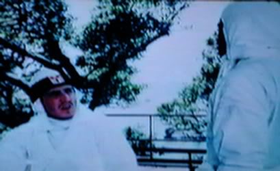 Les premières images font saliver. Deux ninjas en pyjamas blancs font leur gym ninja matinale, Paul Tocha faisant de la méditation sous un kiosque. J'ouvre une parenthèse ici pour émettre l'idée qu'il faudrait un jour faire une étude approfondie sur cet élément urbain, tant il semble prendre une importance ô combien capitale dans la vie nanarde de tous les jours. Mais revenons à nos ninjas. Après quelques minutes, un élément nouveau vient sortir du lot ce chouette petit métrage. Il y a... une voix off ! Pour ceux qui se poseraient déjà la question, non ce n'est pas Jean Topart. Cette voix off grandiloquente nous explique comment sont nés les ninjas, comment ils ont mal tourné et comment l'ami Paul (ici dans le rôle de "Jerry Braun" alias Le Dragon d'Or !) et son copain noir Fred (joué par le nigérian Eric Neff) vont remédier à tout ça. C'est vrai, des ninjas au service du mal et qui passent leur temps à enfreindre la loi, ça fait mauvais genre…
