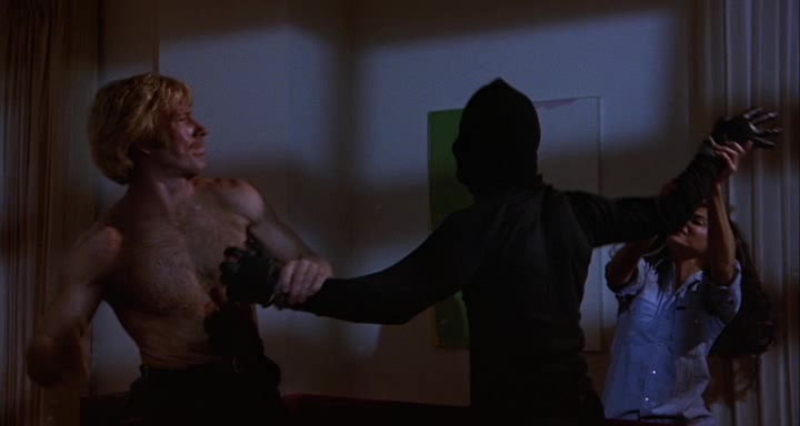 Je sens que vous êtes déjà un peu perdus... Chuck sait donc que c'est son frère. Il va donc voir un ex-ami de son père pour causer de tout ça. Cet ex-ami vit dans un ranch avec une tête de cerf en déco et porte des fringues de chasseur. Ce n'est autre que Lee Van Cleef, qui rayon nanar en connaît un bout ! C'est là que l'on voit que le "scénario" est complètement foireux : on ne saura jamais si Lee Van Cleef est chasseur, chef de mercenaires ou dirige une milice d'extrême droite. Pareillement, quels sont ses liens avec Norris et son père ? Son intervention plus tard apparaîtra tantôt comme un coup de main volontaire tantôt comme de la surveillance intéressée (pourquoi ? Bah ça aussi on le saura jamais). Je vous passe les diverses péripéties avec des ninjas et des mercenaires, de toute façon, c'est laid et Norris gagne toujours !