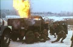 Reste enfin l'un des points forts du film : le « Sweden Power » à outrance affiché par le réalisateur. Comme on l'a déjà compris, pour leur sauver la mise, les Américains n'ont d'autre alternative que de faire appel à l'élite de l'élite militaire : les Suédois. En soi, je ne remets absolument pas en question l'efficacité de l'armée suédoise, mais, au vu de la légendaire neutralité de ce pays dans la plupart des conflits du XXème siècle, ça fait quand même doucement rigoler. Pourquoi pas demander aux Suisses ou aux Luxembourgeois, tant qu'on y est ? Peut-être parce que, contrairement à la Suède, ces deux derniers pays n'ont pas de commandos de ninjas d'élite à proposer à la CIA ? Allez savoir. Mais ce n'est pas tout, la Suède n'a pas que la meilleure armée du monde, mais aussi le matos le plus bath ! La preuve ? Que ce soient les Américains ou les Russes – qu'on croyait pourtant assez fournis en matière de matériel militaire – ils utilisent tous des fusils-mitrailleurs, véhicules et hélicoptères suédois (bon, remarquez, c'est un peu facile, vu qu'il s'agit durant tout le film des trois mêmes Volvo, des deux mêmes camions et du même hélico sur lesquels les assistants décorateurs ont juste apposé un autocollant en forme d'étoile blanche pour les américains, ou de faucille et de marteau pour les russes).