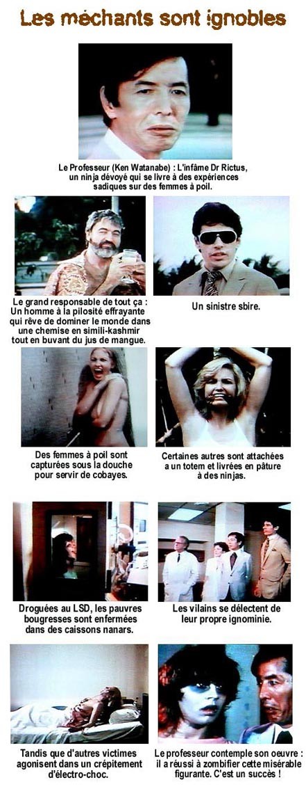 Comme dans tout nanar manichéen qui se respecte, nous avons d'un côté les gentils et de l'autre... vous avez deviné ! Et comme toujours, les méchants de nanars se reconnaissent facilement à ce qu'ils n'ont de cesse que de vouloir dominer le monde en mettant au point des plans crapoteux pour parvenir à un but qu'ils n'atteignent d'ailleurs jamais, les gentils de nanars n'ayant de cesse, pour leur part, que de leur mettre la pâtée. Ici, les méchants sont particulièrement retors : un barbu et un scientifique ex-ninja décident de dominer le monde en dérobant la formule secrète d'un dérivé du LSD à un certain Professeur Harrison (on suppose que c'est un clin d'oeil de Ron Kristoff à son copain Richard Harrison, qui fut en son temps acteur nanar aux Philippines). Les vilains capturent des jeunes filles, les droguent au LSD et les torturent façon « Ilsa la Louve des SS », jusqu'au point de non-retour où, totalement zombifiées, les pauvres filles sont noyées dans un lac. L'histoire ne dit pas comment les vilains comptent régner sur la planète par cette méthode, tout juste saura-t-on qu'ils envisagent de réitérer leurs expériences sur des grands de ce monde afin d'asseoir leur domination (et nous de frémir en pensant à des politiciens connus subissant des électrochocs à poil dans un caisson !).