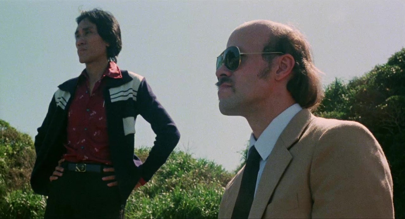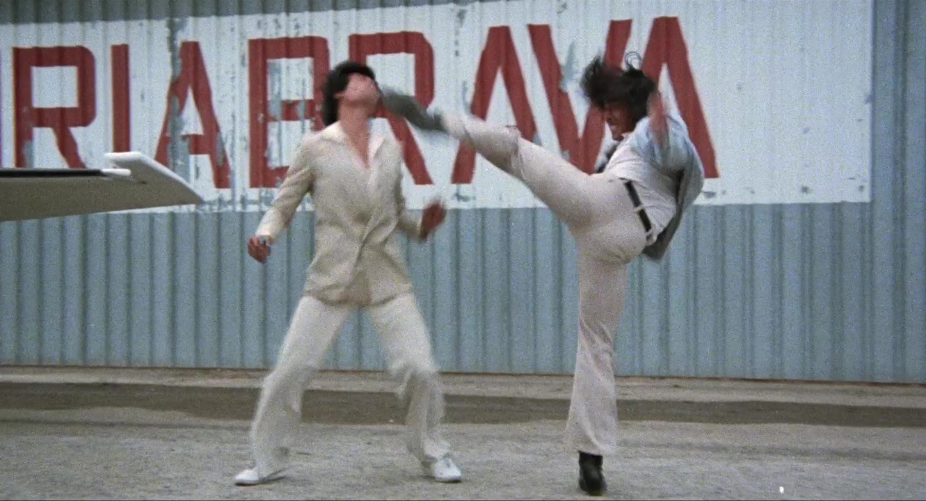 John Liu, avec cette fausse humilité condescendante qui le caractérise, corrige la posture de Suzan, agent de la CIA interprétée par Raquel Evans. Une actrice de films érotiques qui incarna notamment une pseudo Emmanuelle dans "Emmanuelle y Carol" (1978), et dont la seule présence ici valu au film d'être exploité sur certains territoires sous le titre "Kung Fu Emanuelle" !