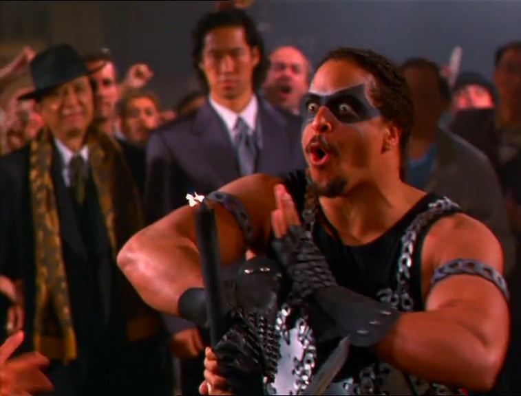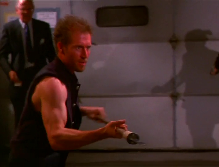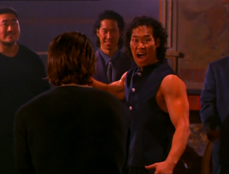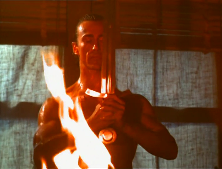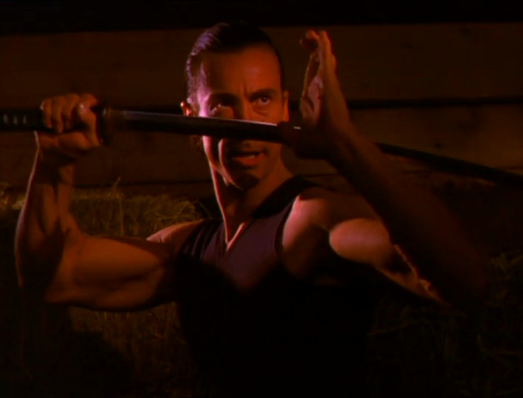 Dans le même temps, l'antagoniste Parmenion et ses sbires se rendent à Hong-Kong pour récupérer l'épée d'Alexandre le Grand, Graal des précédents films. Je m'arrête d'emblée sur cette très belle séquence qui ravira le nanarophile : Nick Rotundo se sent habité par l'âme de John Woo et filme une séquence d'action des plus enfiévrées... Comprendre en sueur, tremblotante et semi-délirante. Le deal de l'épée avec les triades locales dégénère rapidement et donne lieu à une fusillade à laquelle s'opposent... des moulinets de sabres pare-balles ! Rendus impuissants par cette technique ancestrale déconcertante d'efficacité et de bonne humeur, les mafieux se font exterminer à coups de high kicks et de décapitation. Parmenion jubile.