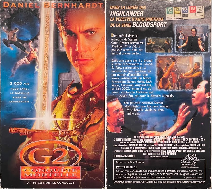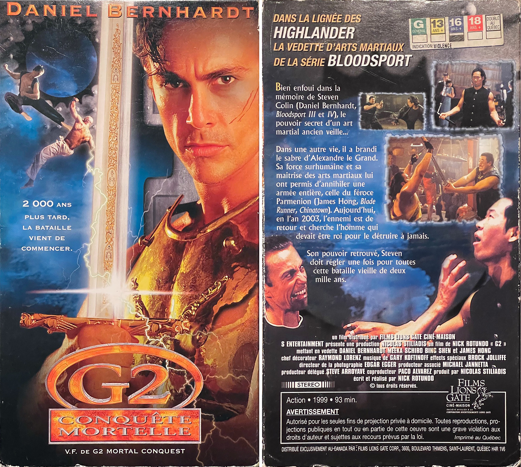 Barème de notationMalgré la présence sur imdb d'un titre français (Sword, l'épée) et d'un titre québécois (G2 Conquête Mortelle), je n'avais pas réussi à mettre la main sur une édition francophone au moment de publier cette chronique. Mais grâce à notre forumeur Cyborg, ma frustration est désormais apaisée : il a en effet repéré le film en VF sur les internets, ainsi qu'une jaquette québécoise.