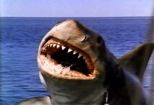 Le terrifiant monstre marin en question n’est rien d’autre qu’une vulgaire baudruche, invertébrée et amorphe, pas crédible une seconde, et qui n’arrive même pas à nager droit ! Un peu comme s’il avait bu un coup de trop. Bref, le moins que l’on puisse dire c’est que le manque de moyens se fait bien sentir à chacune de ses apparitions. Il va donc de soi que n’importe quel individu sensé aurait alors pris le parti de montrer le moins possible le requin, en tentant plutôt d’instaurer un suspense reposant sur une menace invisible. Eh bien Joseph Sargent, lui, préfère filmer son requin en gros plan tout au long du film ! Et là ça ne pardonne pas : la texture lisse de la peau trahit la nature plastifiée du monstre et l’on aperçoit même furtivement une fermeture éclair (!) derrière son aileron… (à quoi peut-elle donc bien servir ? Mystère… Et si le requin n’était en fait qu’un ou deux acteurs dans un costume en caoutchouc ? Cela expliquerait pourquoi il avance si lentement et n’arrive pas à garder une trajectoire droite et régulière…).