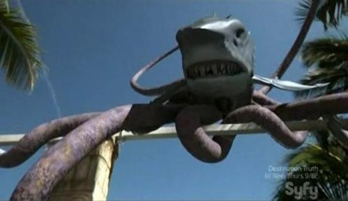 Le croisement entre un requin et une pieuvre s’échappe d’un laboratoire et vient semer la terreur en pleine saison estivale. L’idée n’est pas nouvelle, Apocalypse dans l'Océan Rouge de Lamberto Bava il y a vingt cinq ans nous servait la même tambouille sur un canevas sensiblement identique à celui de notre Sharktopus. A ceci près qu’à l’époque, on n’avait pas d’images de synthèse, mais un monstre en animatronique. Un truc ressemblant à une citrouille avec des dents qui balançait mollement ses tentacules en mousse sur les bateaux de passage.