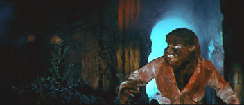 Balourd, sans aucun charisme, carré et trapu, Paul Naschy ne sait pas quoi faire de son corps, se balance d’un pied sur l’autre, lance des regards atones censés exprimer l’inquiétude. Quand il se transforme en loup-garou, c’est la débandade la plus totale. Moulinant des bras, grognant « Awarrr-Agrrrr-Rawaaaa ! », le visage recouvert d’une moquette noirâtre, le loup-garou ibérique fait exploser le baromètre du ridicule, surtout quand il bondit sur ses victimes comme un cabri en balançant ses jambes dans tous les sens, comme dans un spectacle de danse post-moderne.