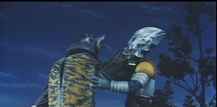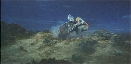 - Ah oui, j’allais oublier : Megalon est épaulé ce soir par un renfort surprise, rien moins que la pintade géante Gigan, prêtée directement aux Seatopiens par la planète M, comme ça, sans autre justification scénaristique. Et oui, ce bon vieux Gigan avec son œil unique qui lui donne cet air éveillé si caractéristique et surtout sa scie circulaire sur le ventre !